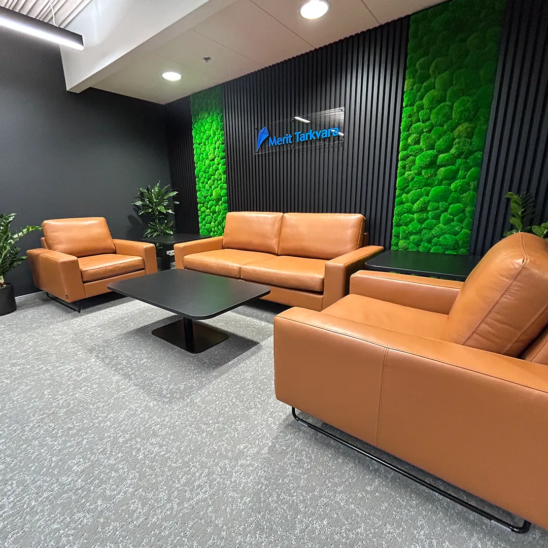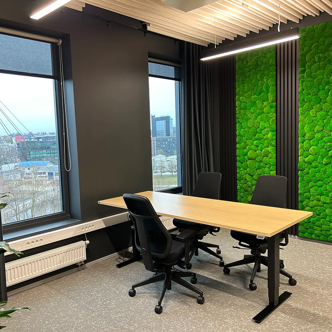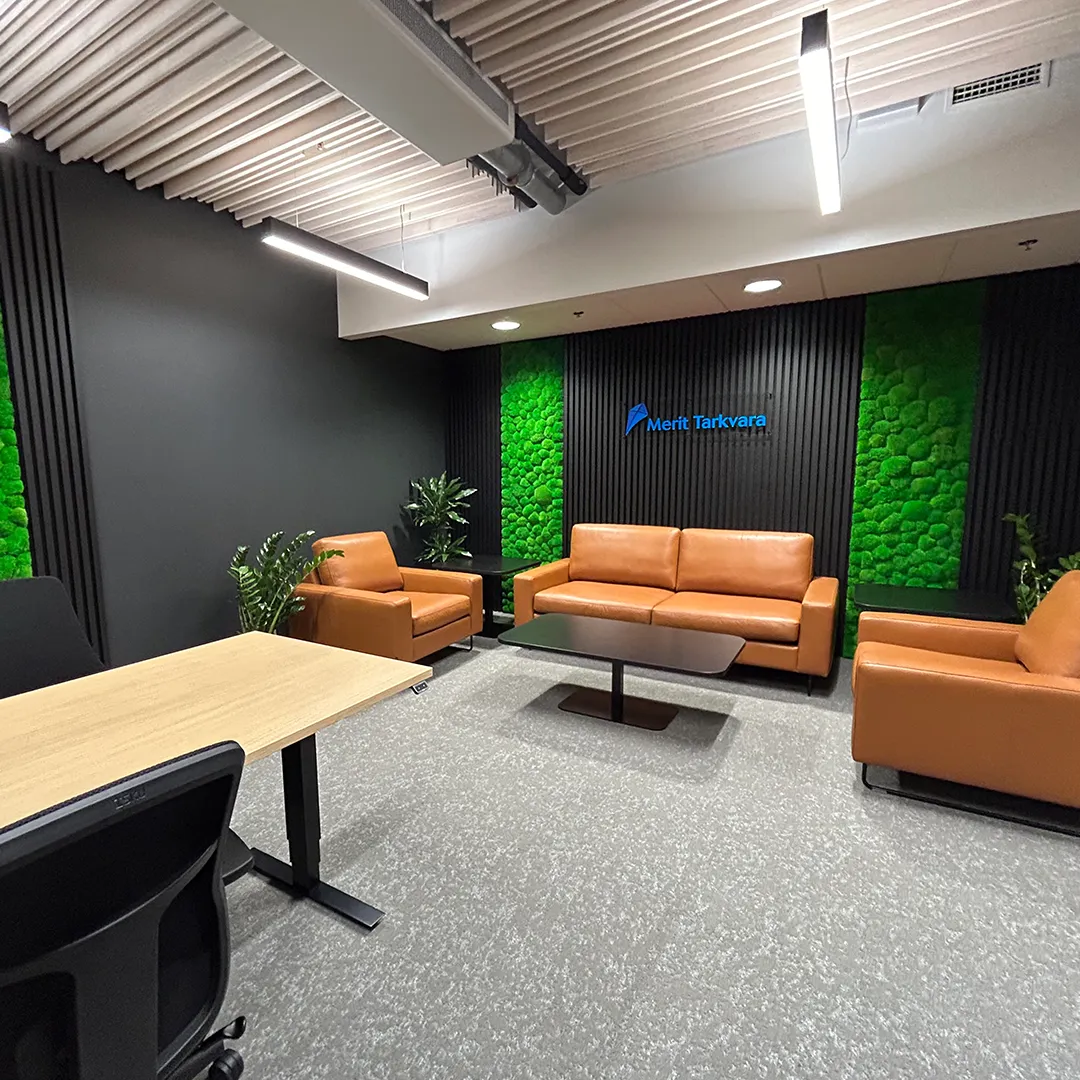 Ruum on jaotatud kaheks – pruun nahkdiivan ja tugitoolid loovad mõnusa ja vaba vestlusala, samas kui kirjutuslaud koos töötoolidega võimaldab vestluspartneritel silmsidet hoida ja professionaalsema formaadiga salvestusi teha. Valgustus on pehme, et vältida tugevaid varje kaamerapildis, kui podcast’e filmitakse. Kõik detailid on läbi mõeldud, et pakkuda nii külalistele kui ka salvestajatele mugavat ja inspireerivat keskkonda.